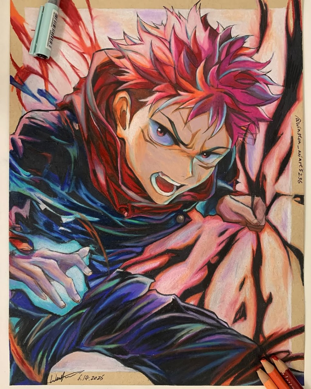 Winston_aniart5236 captures the explosive moment of Yuji Itadori from Jujutsu Kaisen in a stunning drawing created with colored pencils. The artist conveys the raw intensity of the protagonist as he unleashes his cursed strength. The highly dynamic composition plunges us directly into the action, with Itadori’s screaming gaze fixed on his opponent with fierce determination.